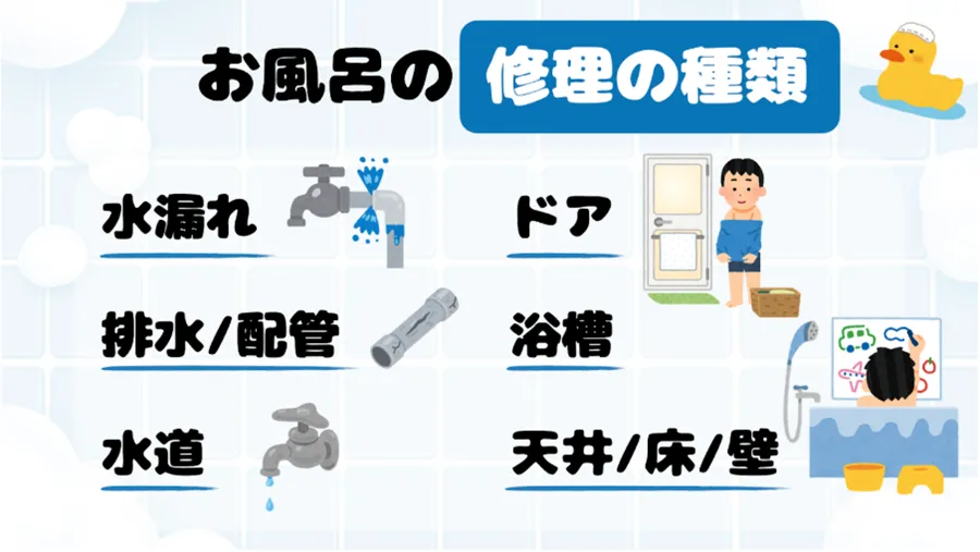 お風呂の修理は、主に2種類に分けられます。