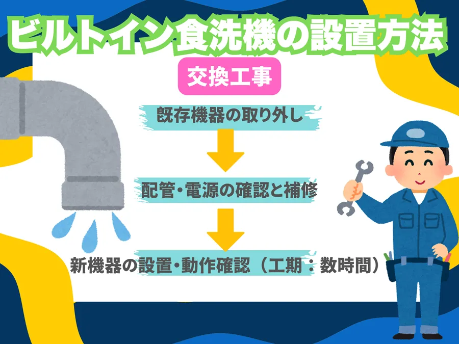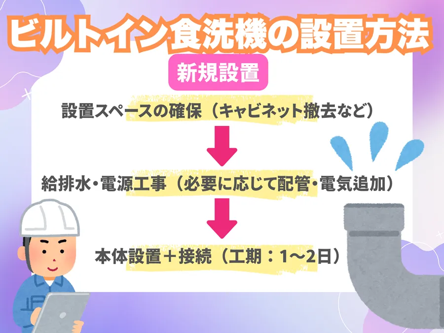 新規設置では、食洗機本体の価格に加え、配管工事や電気工事などを含めて10万円〜25万円程度が一般的です。