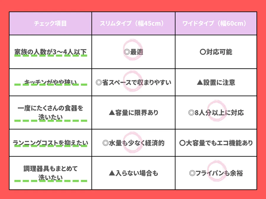 それでもどちらを選べばよいか迷ったときは、現在の洗い物の量を記録してみると、必要な容量が見えてくるでしょう。