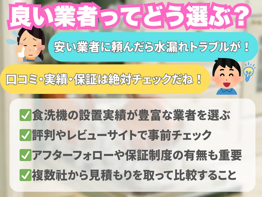 あるいは、新築時や大規模リフォームのタイミングであれば、ハウスメーカーやリフォーム会社が一括で対応してくれるケースもあります。それぞれにメリットがありますが、重要なのは「食洗機の設置実績が豊富な業者かどうか」という点です。