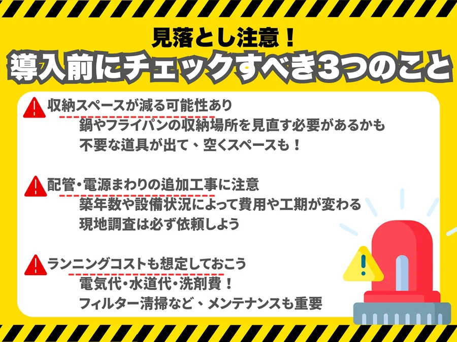 ビルトイン食洗機は非常に便利な設備ですが、設置してから「こんなはずではなかった」と後悔しないためには、導入前にいくつかの注意点を把握しておく必要があります。ここでは、導入時に見落としがちなポイントを解説します。