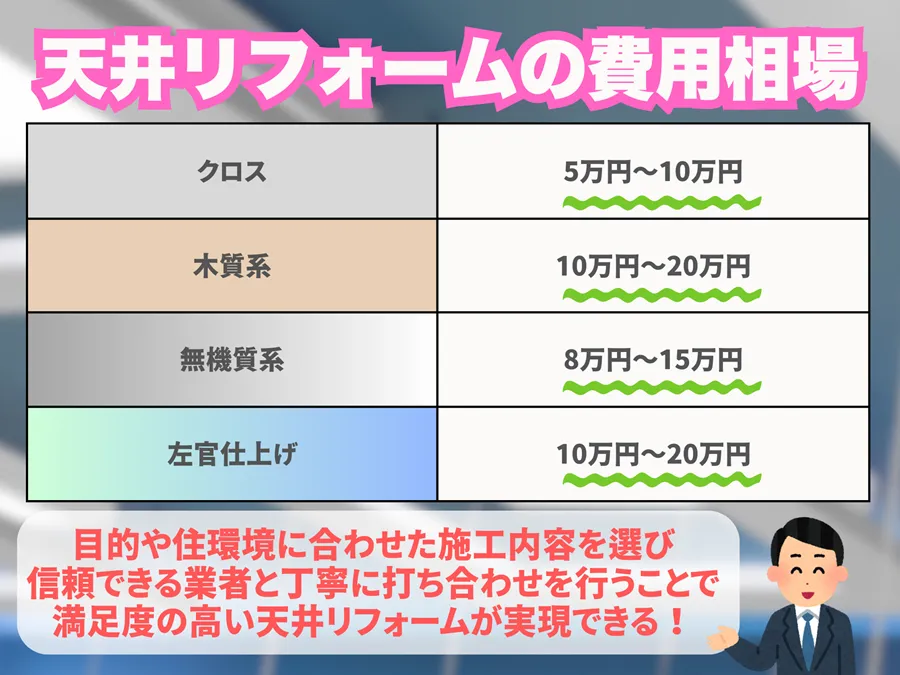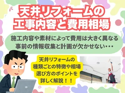 天井リフォームを検討する際は、費用相場や工事の種類を正しく把握しておくことが重要です。