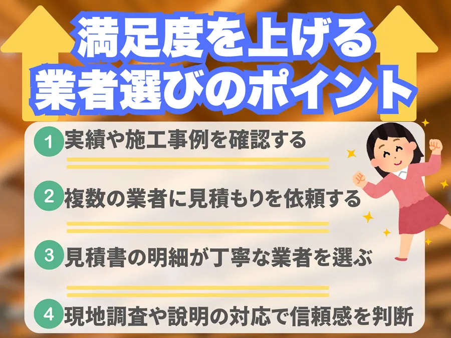 施工業者を選ぶ際は、実績や評判を確認し、複数の見積もりを比較することで費用と内容のバランスが判断しやすくなります。