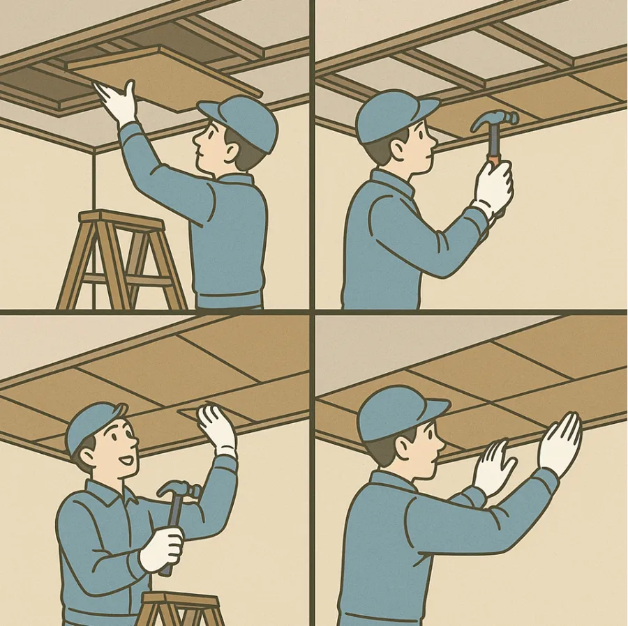 張り替えには既存の天井板の撤去や下地補修が含まれるため、2日〜3日程度の工期が必要です。デザイン性の高い天井板を選べば、室内全体の雰囲気が引き締まり、住まいの価値向上にもつながります。