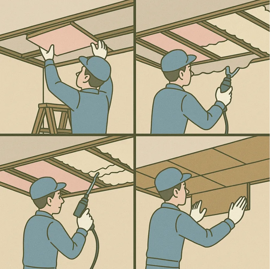 まず、現地調査によって天井の状態や施工の可否を確認し、要望を整理します。次に、見積もりとプランの提案を受け、内容を十分に検討した上で契約を結びます。契約後は施工スケジュールの調整や資材の手配を行い、工程表に基づいて工事が進行します。