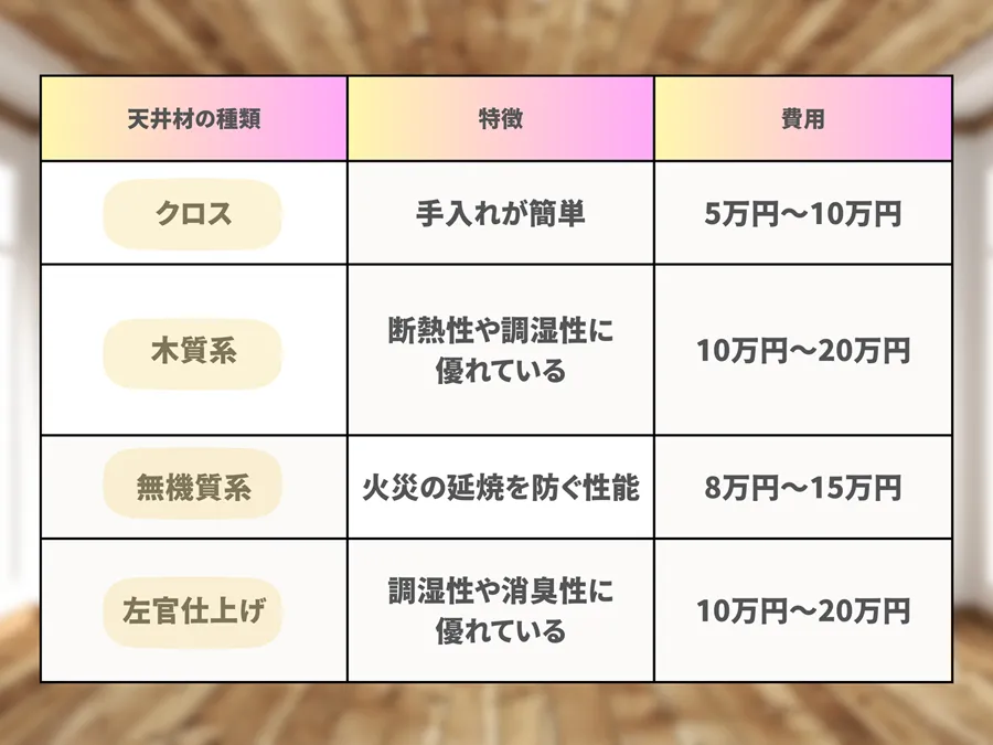 ここでは、天井リフォームの選び方や種類別のメリットやデメリットを紹介していきます。
