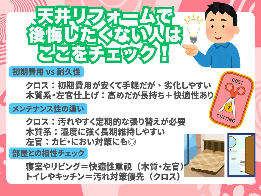 天井リフォームで後悔しないために、次のようなポイントに気を付けましょう。