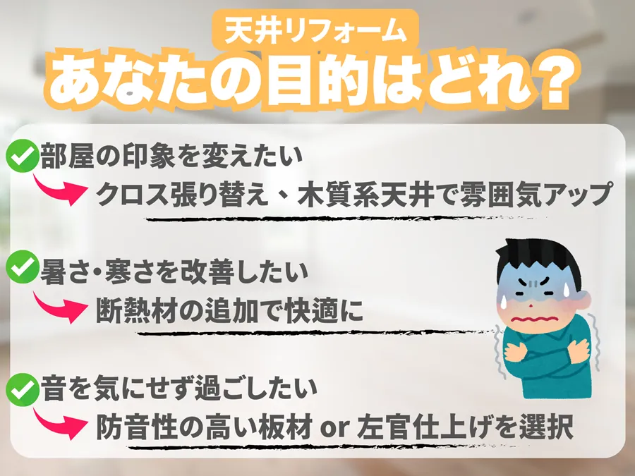 天井リフォームを検討するときは、目的を明確にすることが重要です。