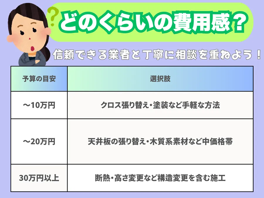 天井リフォームの費用相場は、施工内容や使用素材によって幅がありますが、目的に合った選び方をすることで無駄のない工事が可能です。