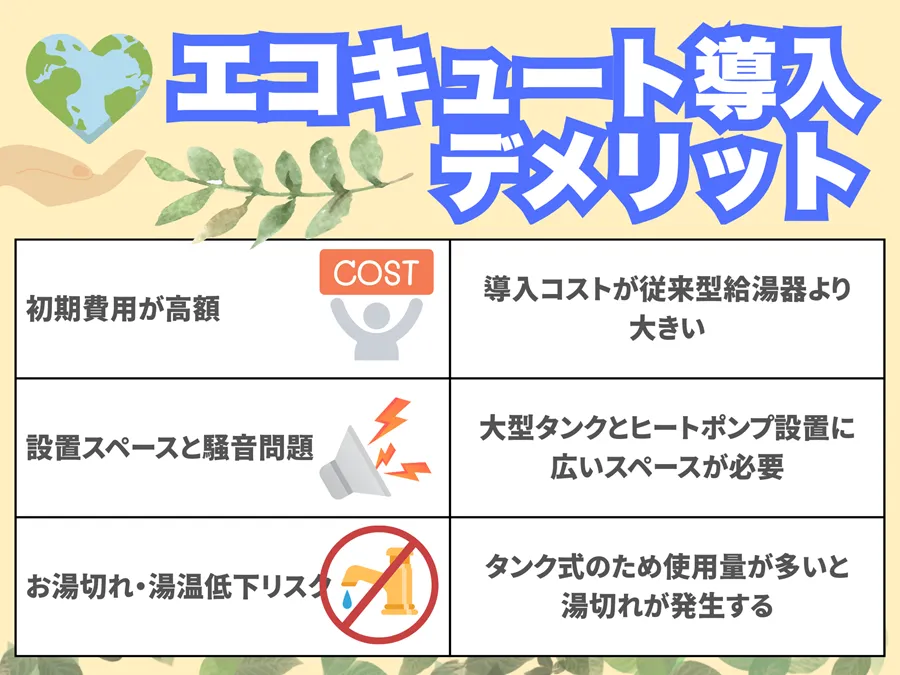 | デメリット|設置スペースと騒音問題 | 大型タンクとヒートポンプ設置に広いスペースが必要 | 狭小住宅や集合住宅では設置困難な場合あり。夜間稼働時の運転音が近隣との距離が近い環境でトラブルにつながる可能性もある。 |