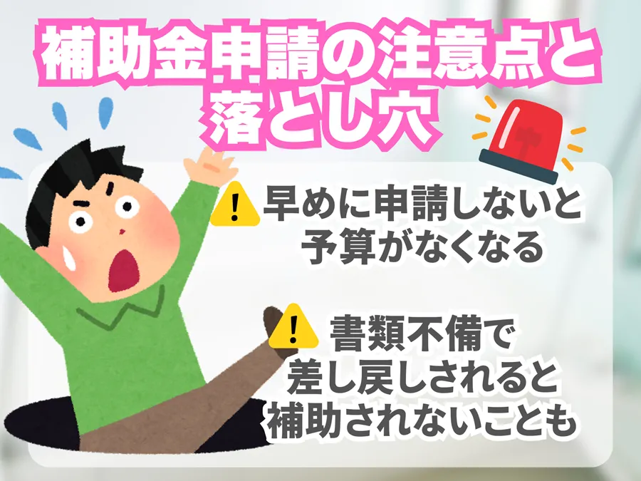 補助金を利用する際には、申請タイミングの遅れと 書類の不備には充分注意しなければいけません。 ある方は申請が遅れたため既に予算枠を過ぎてしまい、補助金を受けられなかったことがあります。