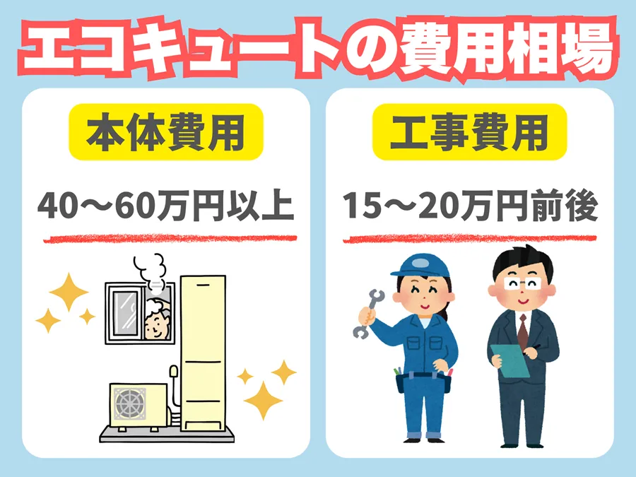 エコキュートはメリットが多い一方で、導入時の費用が大きなハードルになります。 本体価格と設置工事費を合わせると40〜70万円前後が相場であり、給湯器の交換費用としては高額です。