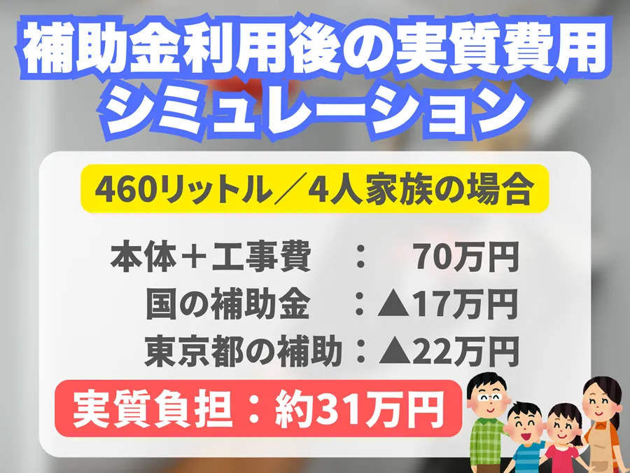 (例:17万円+22万円などで総額39万円、他にも区市町村での補助を加算) この家庭は家族4人で460Lのフルオート機種を選択し、 補助金適用後は実質負担を大きく削減できました。