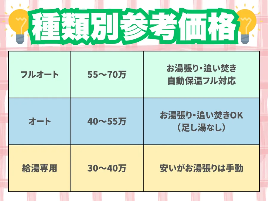 ダイキンは省エネ性能に加えて静音設計を重視し、45万〜55万円程度が多いです。日立は追い焚き性能や湯はり機能に強みがあり、同じく50万円前後が中心です。