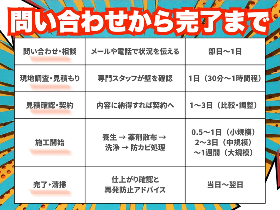 壁のカビ取り施工を依頼するとき、「どのような手順で進み、どれくらいの時間がかかるのか」気になる方は多いでしょう。スムーズな施工のためには、全体の流れや各段階で必要な日数をあらかじめ把握しておくことが大切です。
