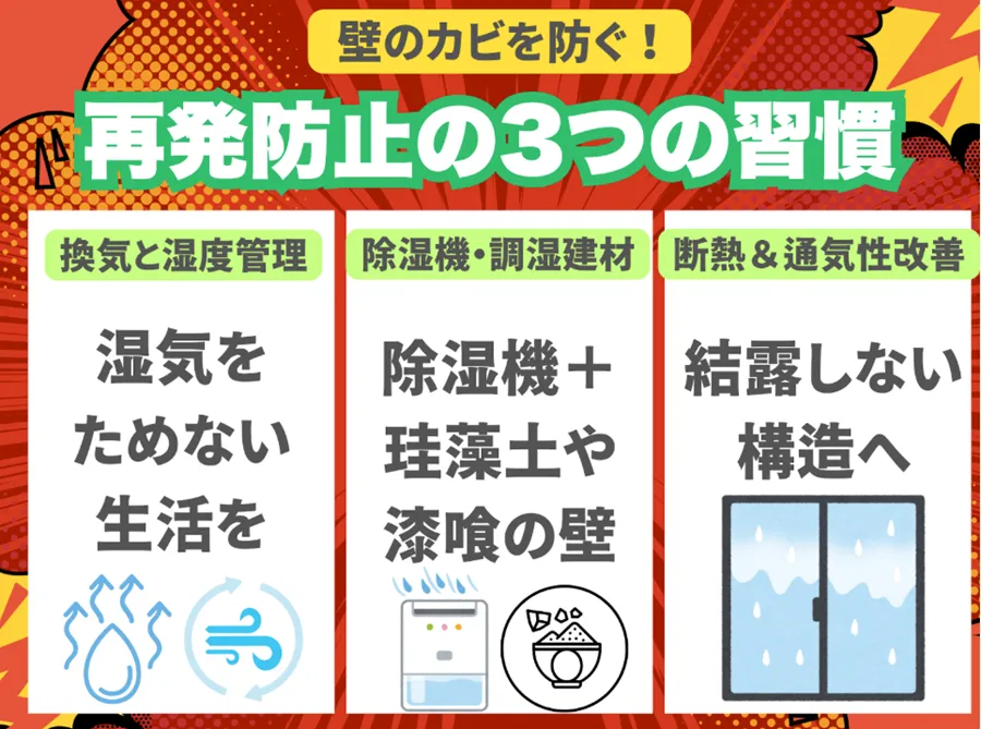 壁のカビは、一度取り除いても再発しやすい問題です。そのためカビ取りだけで終わらせるのではなく、再発を防ぐための対策が欠かせません。ここでは日常的にできる湿度管理や換気の習慣から、除湿機や調湿建材の利用、さらに結露や断熱の改善など本格的な対策まで幅広く紹介します。