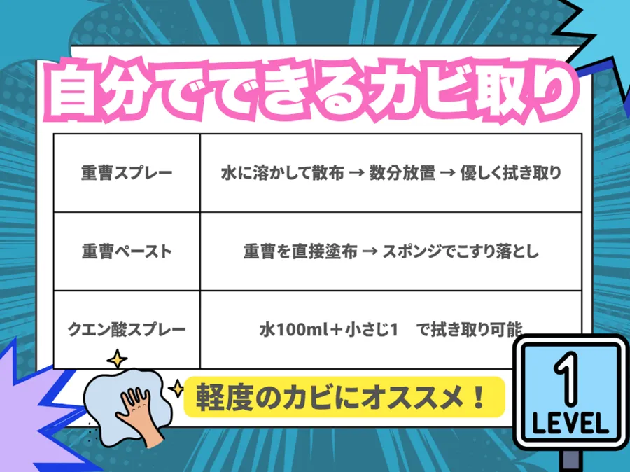 軽度なカビに対しては、この2つを場面に応じて使い分ければ効果を発揮します。使い方としては、重曹を水に溶かしてスプレーし、しばらく時間を置いたあとにやさしく拭き取る方法が一般的です。