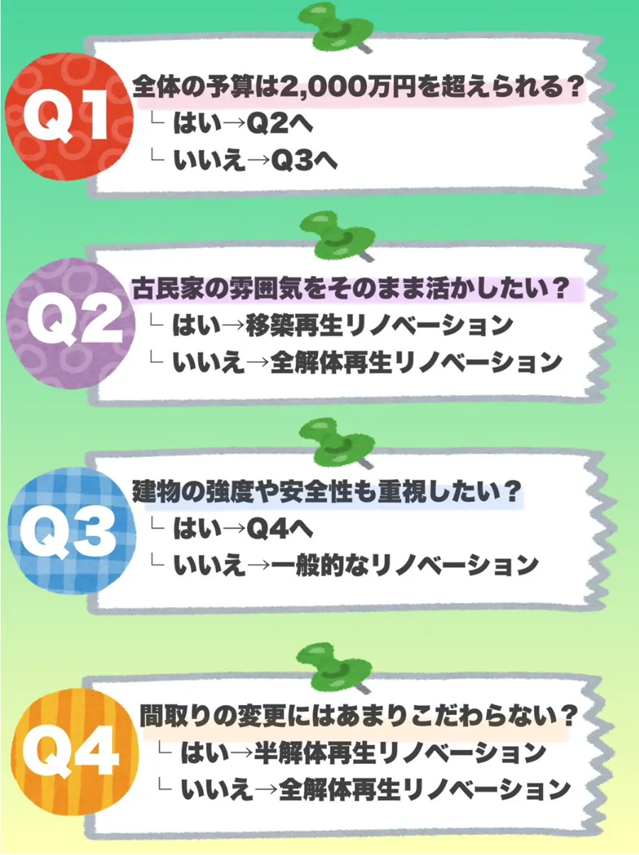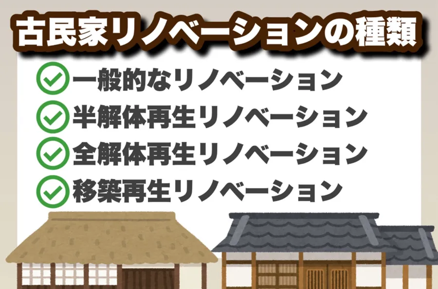 一般的な改修から全解体・移築再生まで幅広い選択肢があり、理想の住まいに合わせたプランニングが重要です。