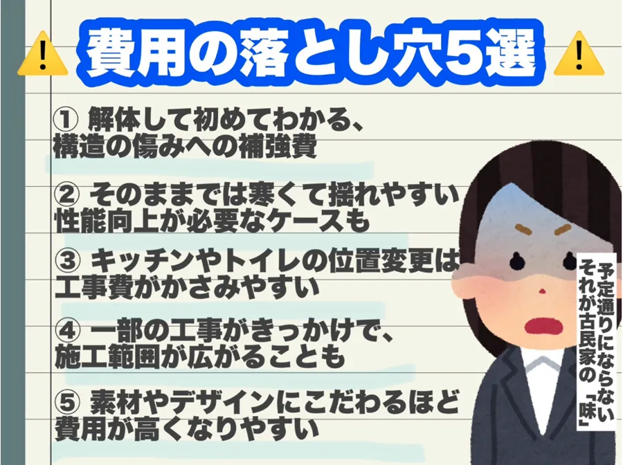 古民家をリノベーションする場合には、見えない場所への費用を考える必要があります。