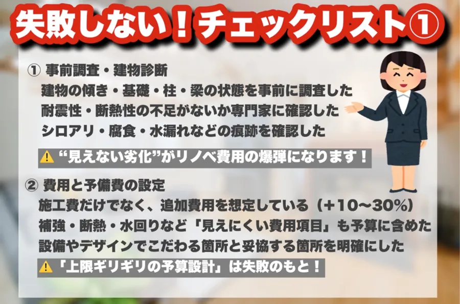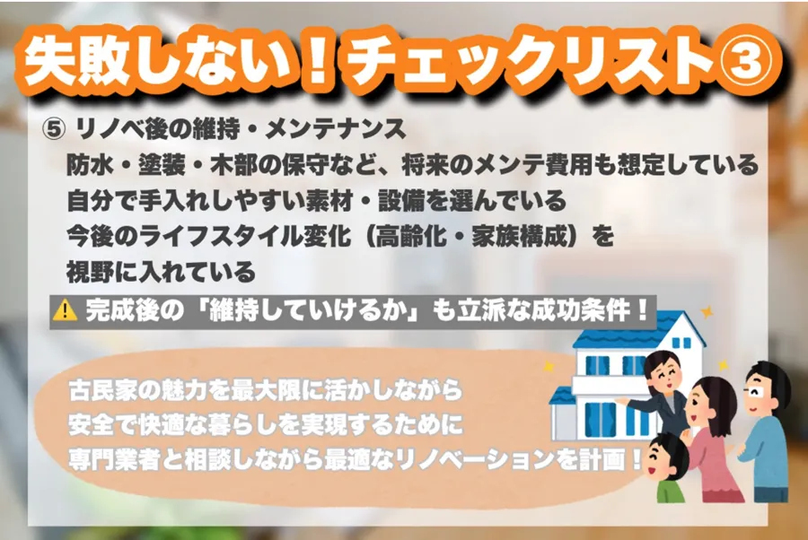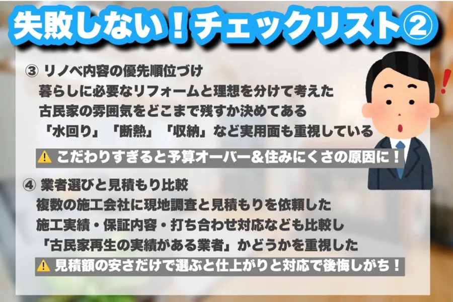 古民家リノベーションで後悔しないために、次のようなポイントに気を付けましょう。