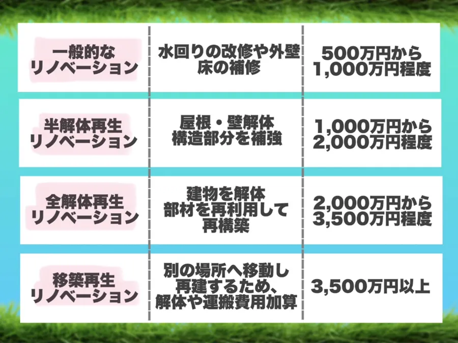 | 全解体再生リノベーション | 伝統的な雰囲気を残しながら、耐久性が向上できる | 費用が高額になりやすい |