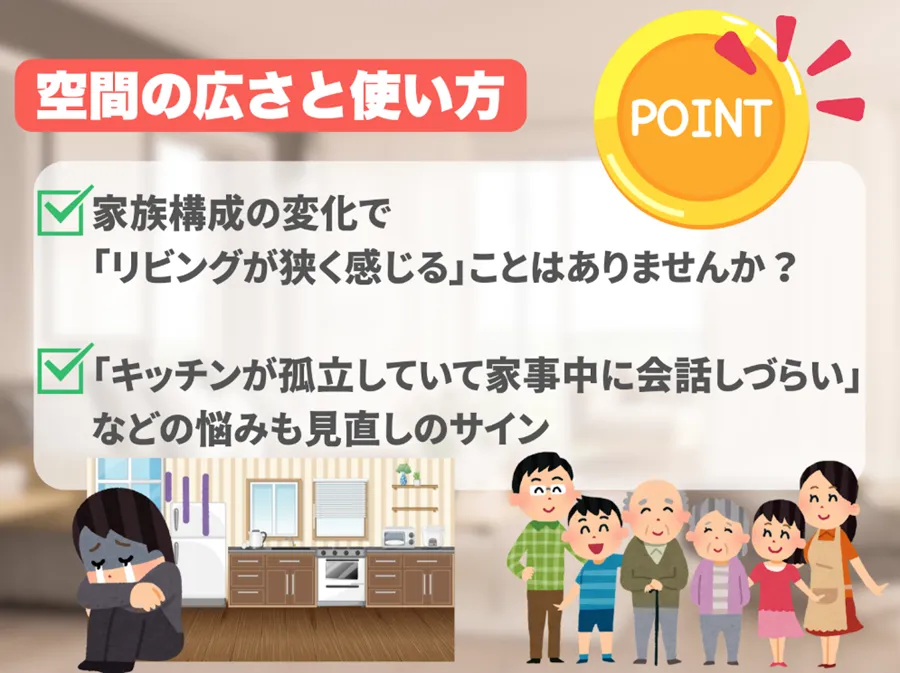 まず考えたいのは、今のLDKの広さや使い方が、家族と生活する上で合っているかどうかです。 たとえば、子どもが成長して家族みんなで過ごす時間が増えたことで、「リビングが少し狭く感じる」といった変化があるかもしれません。