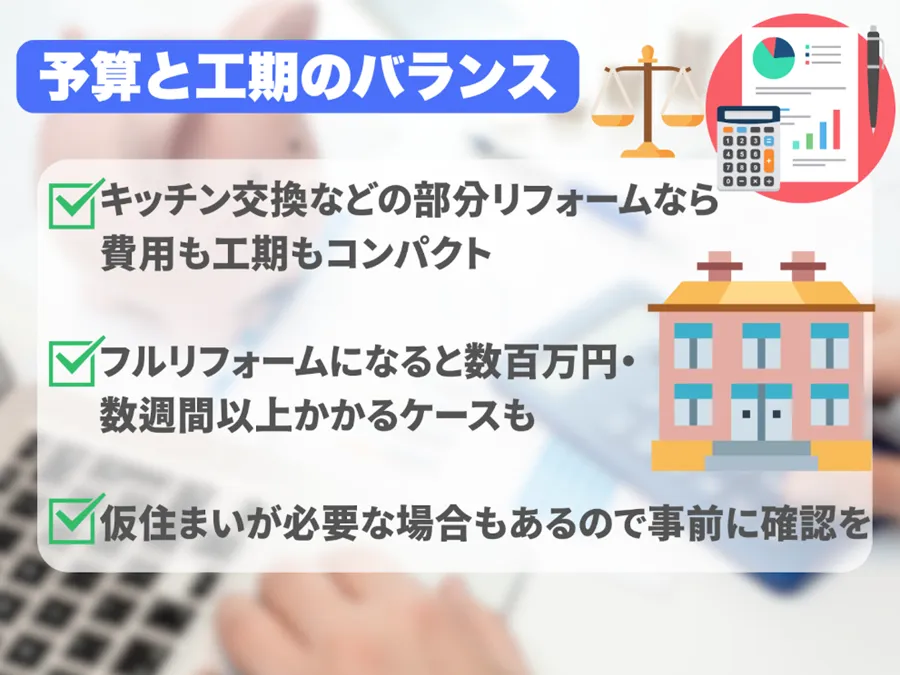どこまでのリフォームをするかは、予算とのバランスも大切です。 「古くなったキッチンだけを交換したい」といった部分的なリフォームであれば、フルリフォームに比べて費用を抑えられ、工期も短く済みます。