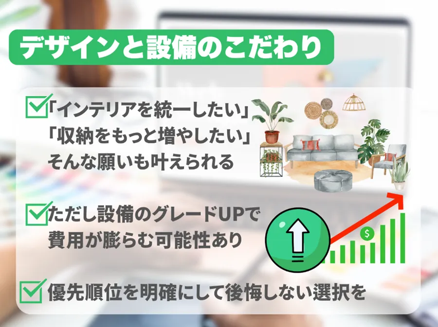 しかし、ここで注意したいのが「費用のバランス」です。 設備や素材にこだわるほど、当然ながら金額も上がっていきます。たとえば、キッチンを最新のモデルにすると、それだけで数十万円の差が出ることも珍しくありません。