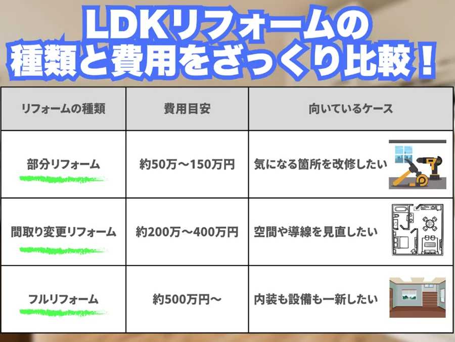 LDKリフォームにはさまざまな方法がありますが、大きく分けると「部分リフォーム」「間取り変更リフォーム」「フルリフォーム」の3つです。 どのリフォームがあっているかは、家の状態や家族構成、ライフスタイルによっても違います。 それぞれの特徴と費用の目安を詳しく見ていきましょう。