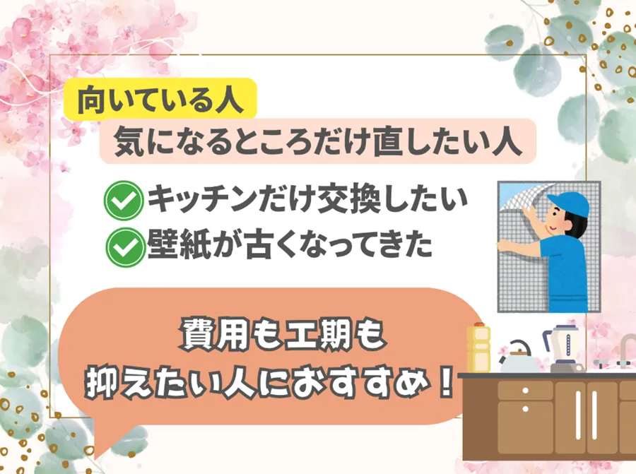 「古くなったキッチンを入れ替えたい」「壁紙の汚れが目立ってきた」など、気になる部分だけを変えたい方に選ばれています。