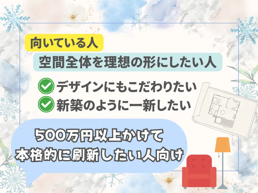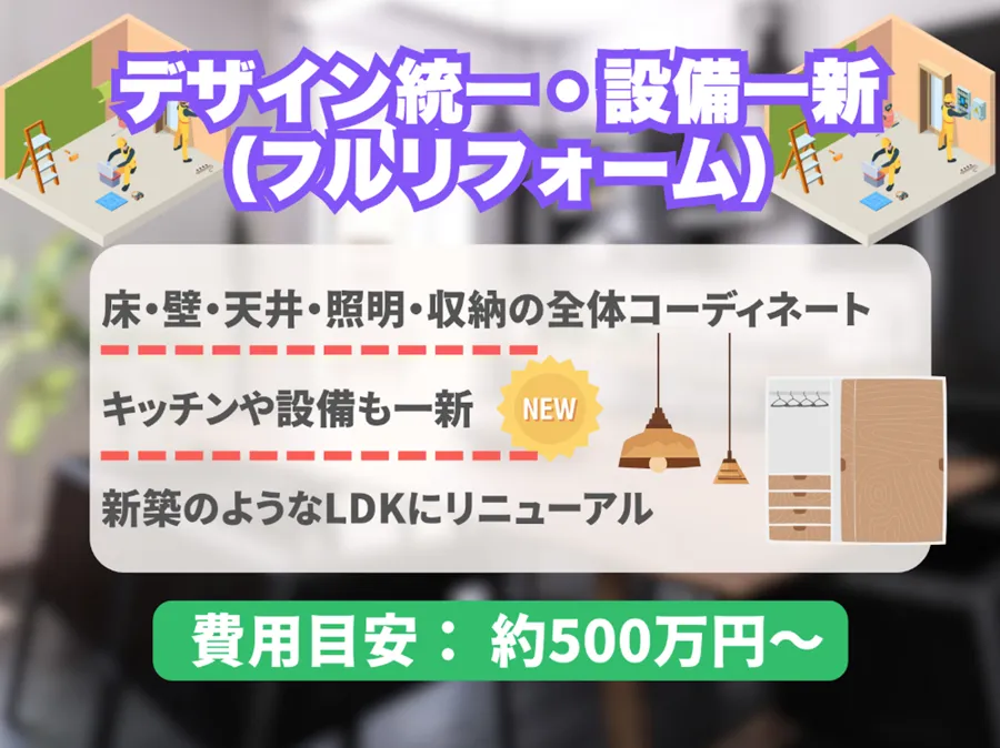 | フルリフォーム | デザイン・機能性の両立ができ、新築同様の仕上がりになる | 準備・計画に時間がかかる、仮住まいが必要なことがある |