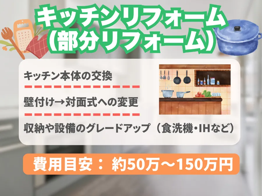 キッチンや壁紙、床材など、LDKの一部分だけを改修するのが部分リフォームです。
