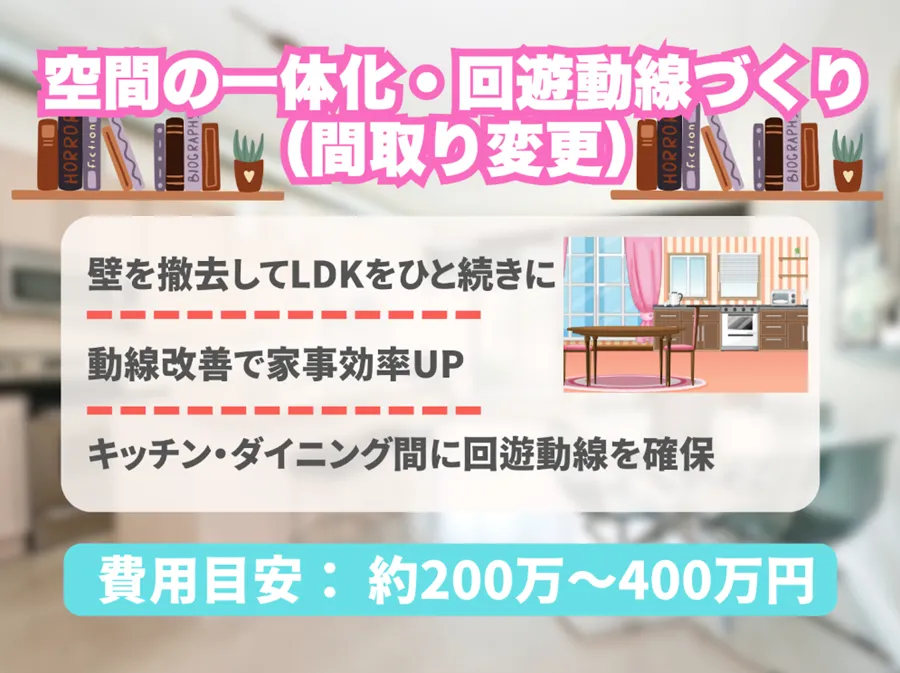 こうした間取りの変更には、構造的な制約や配線・配管の調整が関わるため、費用は200万円〜400万円程度が一般的な相場です。 LDKの広さによって変わるため、詳しい値段は、リフォーム会社に見積もりを取ってみるのが良いでしょう。
