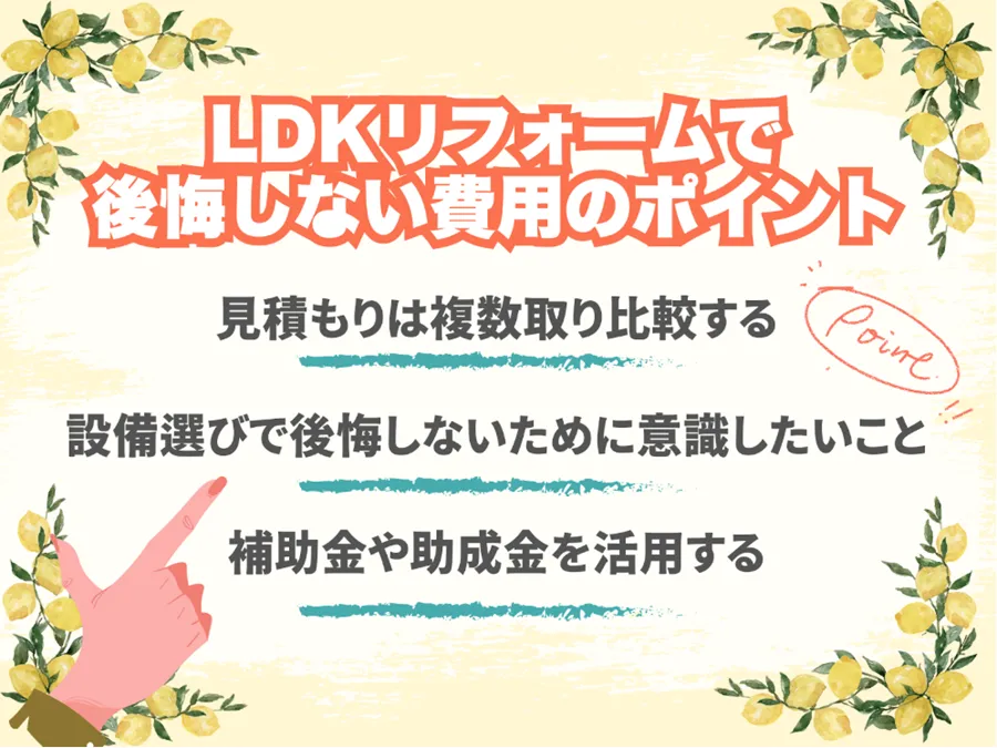 LDKリフォームは、家の中でも広い範囲に関わる大がかりな工事になることが多いため、費用に不安を抱えている方も多いのではないでしょうか。 「思ったよりも高くついた」「もっと比較しておけばよかった」といった後悔をしないために下記の方法を紹介します。