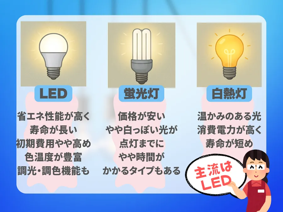 - 白熱灯:温かみのある光で雰囲気は良いが、消費電力が高く、寿命が短め。
