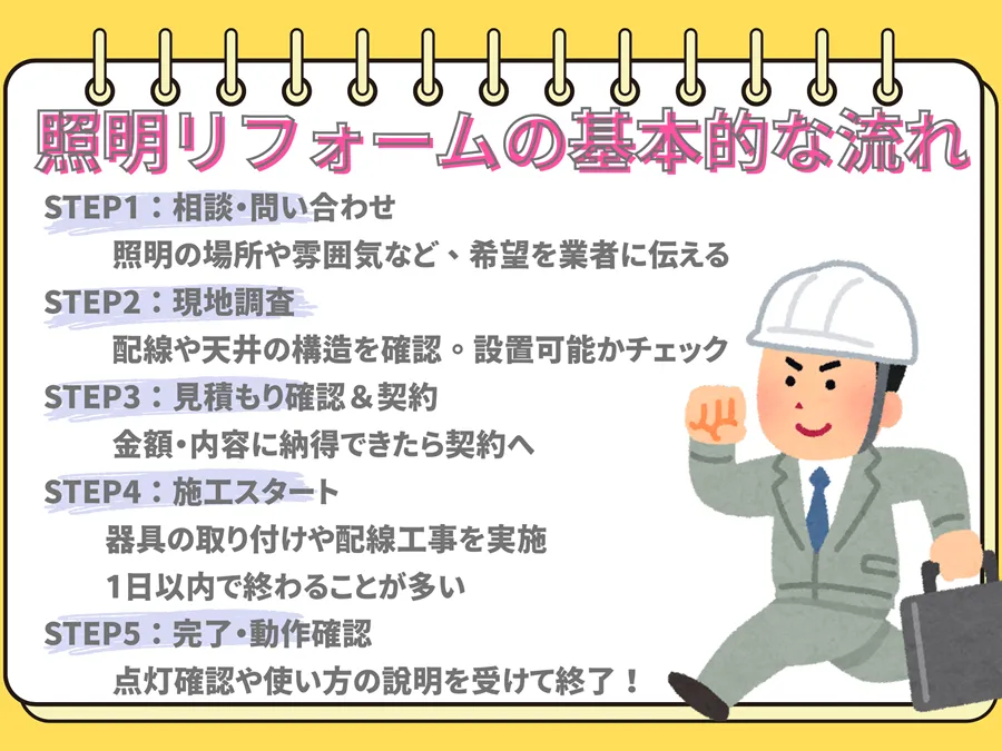 ここでは、一般的な照明リフォームの流れと、完了までの目安日数について詳しく解説していきます。