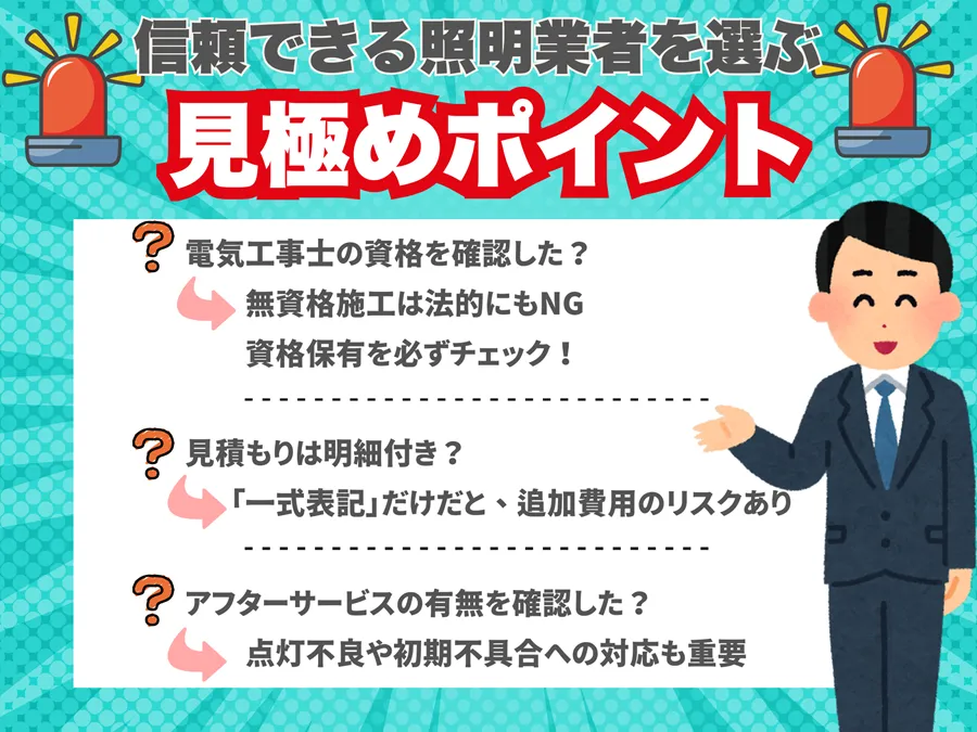 照明リフォームは規模が小さく見えがちですが、施工内容によっては専門的な電気工事を伴うため、信頼できる業者への依頼が欠かせません。満足のいく仕上がりを目指すためには、業者選びの段階でいくつかのポイントを押さえておくことが大切です。