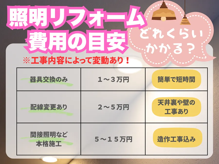 照明リフォームを検討するうえで、まず気になるのが費用の目安です。 一口に照明といっても、交換する機器の種類や設置場所、必要な工事内容によって金額は大きく異なります。