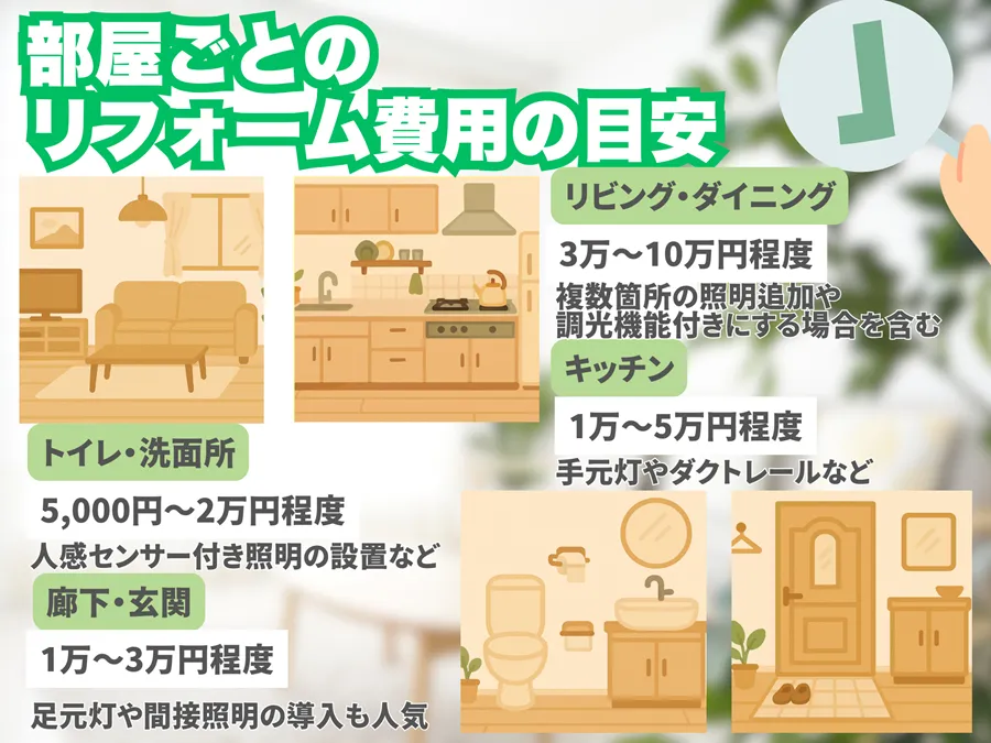 - トイレ・洗面所:5,000円〜2万円程度(人感センサー付き照明の設置など)