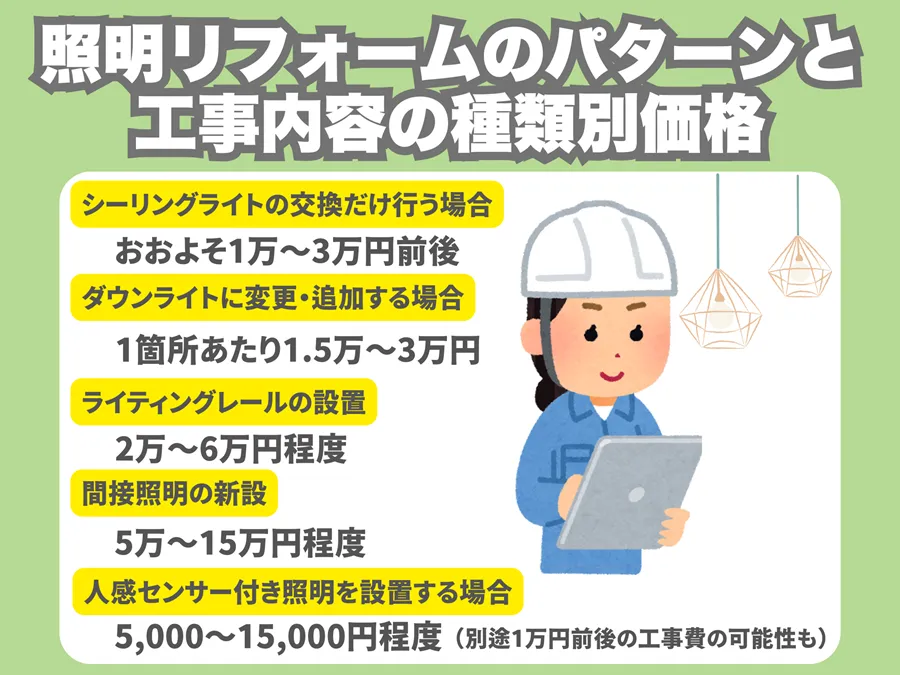 ただし、センサー機能のない既存配線から変更する場合には、 別途1万円前後の工事費がかかる場合もあります。 以上のように、照明リフォームは見た目を変えるだけでなく、機能性や安全性の向上にもつながります。