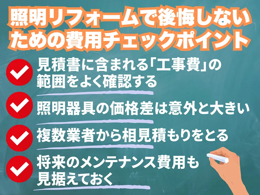 照明リフォームは、見た目だけでなく機能面でも満足度の高いリフォームです。しかし、事前に費用の内訳や注意点を把握しておかないと、「想定より高くついた」「思った仕上がりと違った」と後悔することもあります。ここでは、費用面で失敗しないために、事前に確認しておきたいポイントを紹介します。