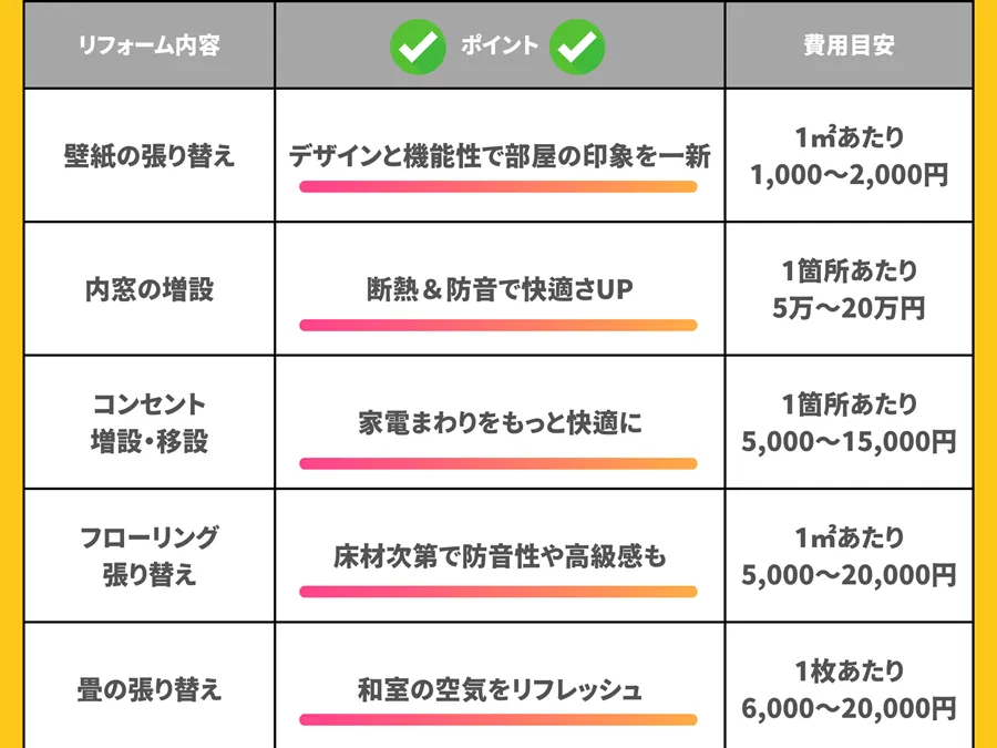 内装リフォームでは、壁紙の張り替えが1㎡あたり1,000円から2,000円、内窓の増設が1箇所あたり5万円から15万円、コンセントの増設や移設が1箇所あたり5,000円から15,000円が目安です。