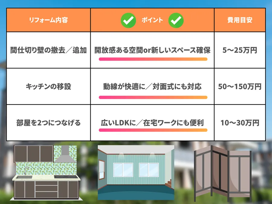 間取りの変更では、間仕切り壁の撤去や追加が10万円から30万円、キッチンの移設は50万円から150万円、部屋を2つにつなげる工事は10万円から30万円程度が一般的です。