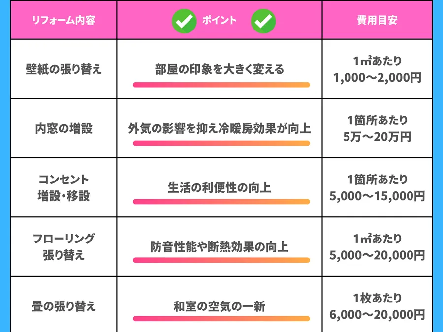 | フローリングの張り替え | 防音性能や断熱効果の向上 | 1㎡あたり5,000円~20,000円 |