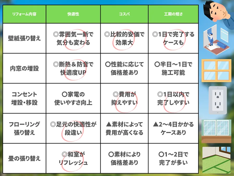 ライフスタイルや使用目的に合った素材を選ぶことが、後悔しないリフォームの実現につながります。
