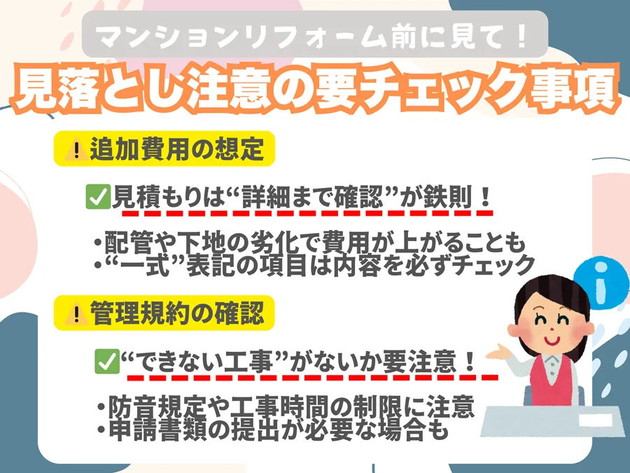 リフォームを進める際には、施工内容だけでなく、マンションの管理規約や工事の可否、追加費用の可能性も確認しておくことが重要です。