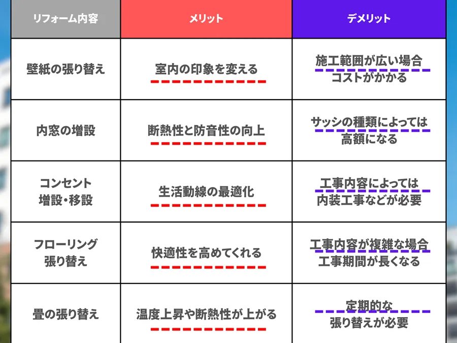 各内装リフォームのメリットやデメリットについて把握しておきましょう。