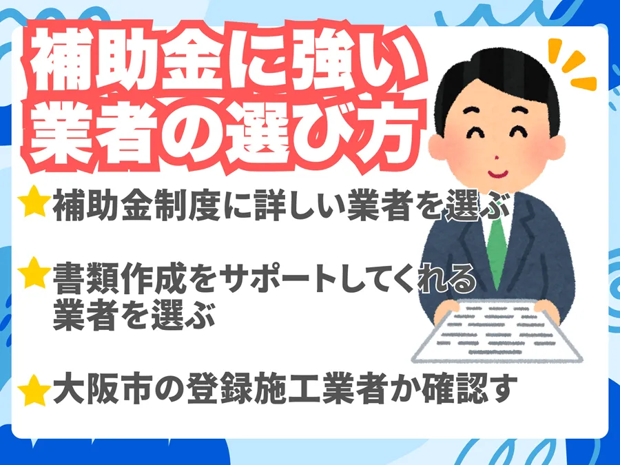 また、自治体が指定する「登録施工業者」であるかどうかも忘れてはいけないポイントです。大阪市の一部補助制度では、登録施工業者であることが申請の前提条件になっていることがあります。仮に非登録業者に依頼した場合、制度の対象から外れてしまう可能性もあるため、公式な登録リストに掲載されているか、事前に業者に確認しておくことが重要です。