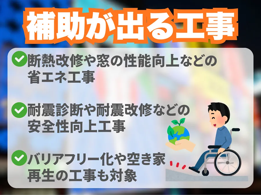 具体的には、耐震補強工事やバリアフリー改修、断熱性能の向上など、住環境の安全性や快適性を高める改修が支援対象になります。こうした支援によって住まいを長く、快適に使い続けられるようになるだけでなく、災害時の被害を軽減し、将来的な修繕費を抑える効果も期待できます。