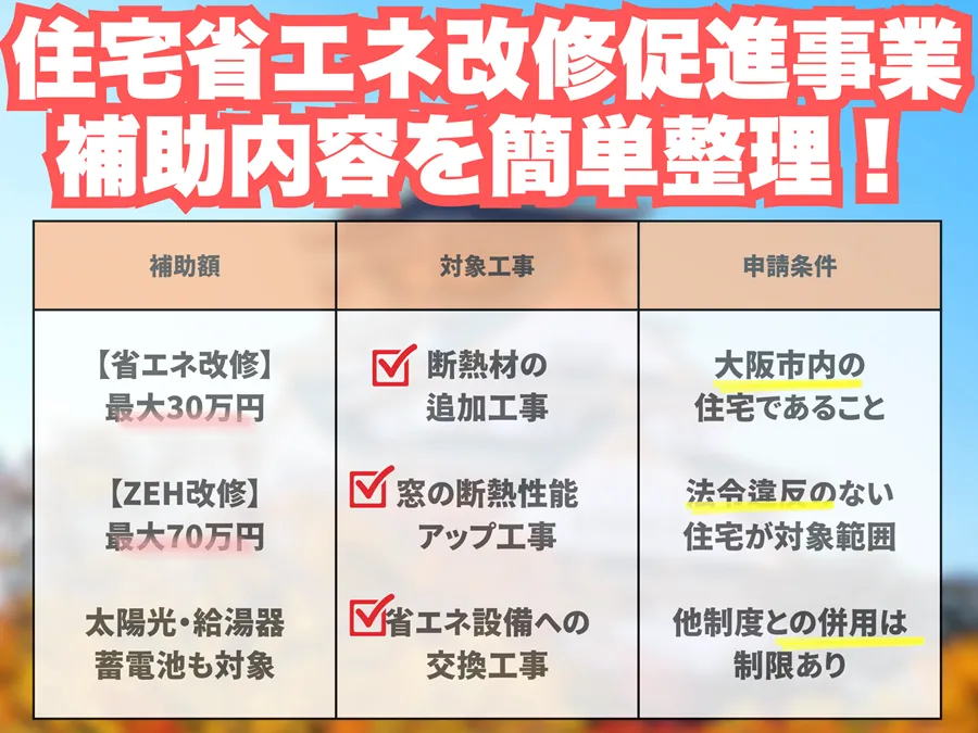 そのほか、申請者は各種税金を滞納しておらず、年間所得合計が1,200万円以下、過去に国や大阪市の補助制度を利用したことがない、などの条件もあります。